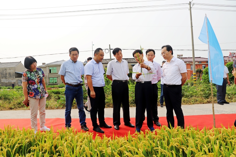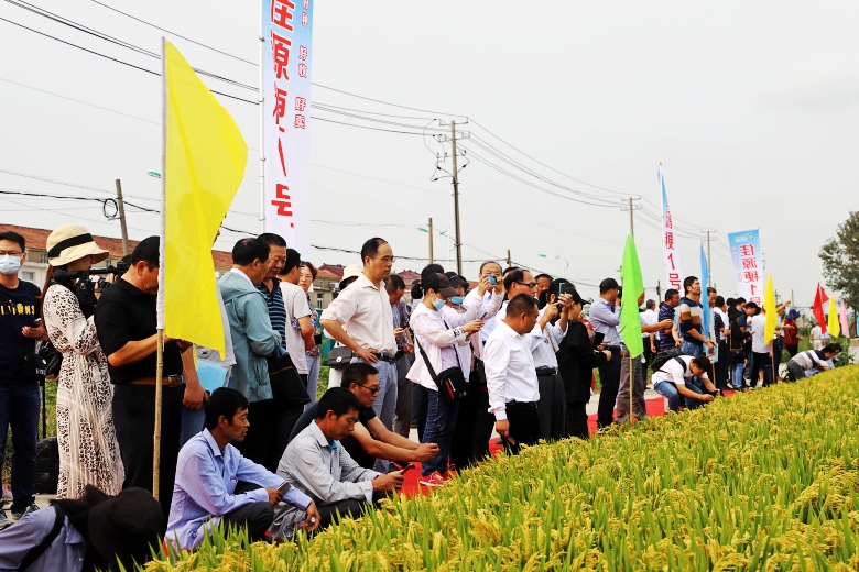參會代表現(xiàn)場觀摩了白馬湖農(nóng)場170畝“佳源粳1號”綠色高質(zhì)高效生產(chǎn)示范方和“江蘇好品種”展示田的“佳源粳1號”,即將收獲的“佳源粳1號” 穗型大,稈青籽黃粒飽,呈現(xiàn)一派豐收景象。參加觀摩的領(lǐng)導(dǎo)、專家和代表對“佳源粳1號”交口稱贊,蔡廳長深入田間查看長勢情況。示范方理論測產(chǎn)809.6公斤。