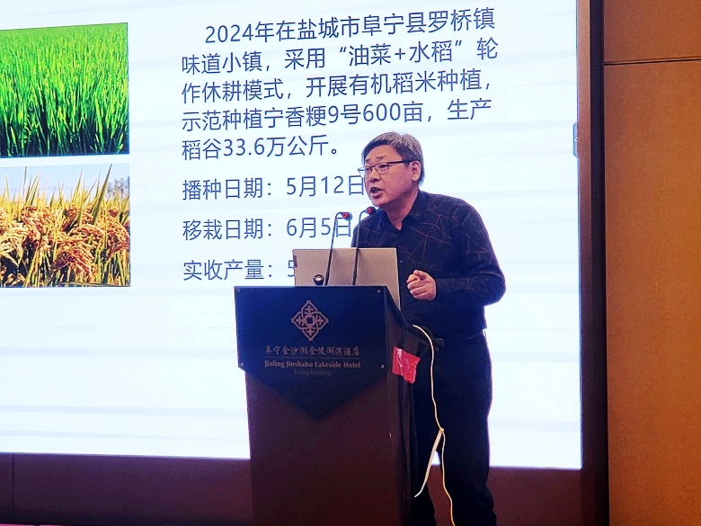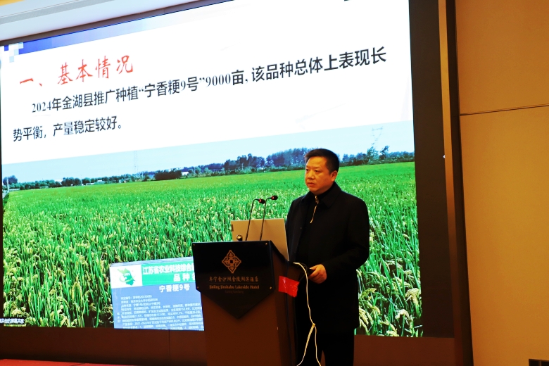 淮安市金湖縣農(nóng)業(yè)技術(shù)推廣中心主任閔季春介紹了金湖縣2024年在推廣寧香粳9號(hào)取得的成就,并表示2025年將加大力度繼續(xù)推廣種植。