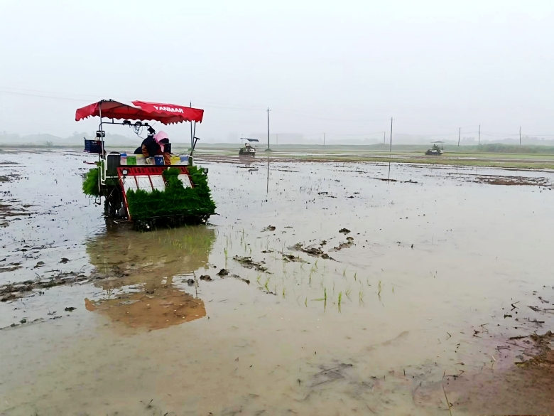 在完成平整與封閉處理的田塊中,數(shù)臺(tái)搭載先進(jìn)自動(dòng)插秧系統(tǒng)的插秧機(jī)來(lái)回穿梭。伴隨著機(jī)器的運(yùn)轉(zhuǎn)聲,一行行嫩綠的秧苗被快速、精準(zhǔn)地植入田中,行距株距均勻整齊,轉(zhuǎn)眼間為大地披上嶄新的翠綠“外衣”,生機(jī)盎然。據(jù)了解,這些智能插秧機(jī)具備精準(zhǔn)控制插秧深度和間距的能力,作業(yè)速度遠(yuǎn)超傳統(tǒng)人工。數(shù)據(jù)顯示,以往人工插秧,一人一天最多完成1至2畝,而一臺(tái)智能插秧機(jī)日均可高效完成50至70畝的插秧任務(wù),作業(yè)效率提升數(shù)十倍。