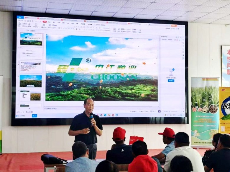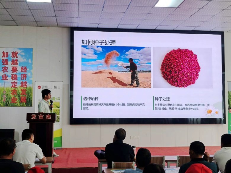 中江種業(yè)蘇中區(qū)域市場(chǎng)銷(xiāo)售負(fù)責(zé)人吳偉在簡(jiǎn)要介紹公司的發(fā)展歷程后,重點(diǎn)就“揚(yáng)麥45”的品種特性、產(chǎn)量表現(xiàn)、栽培技術(shù)及近兩年該品種在多地的大面積示范與推廣成效作了詳細(xì)分享。特別提到,2025年在南通市如東縣吳寶權(quán)家庭農(nóng)場(chǎng),“揚(yáng)麥45”實(shí)現(xiàn)實(shí)收單產(chǎn)1380斤,表現(xiàn)出優(yōu)異的產(chǎn)量潛力。